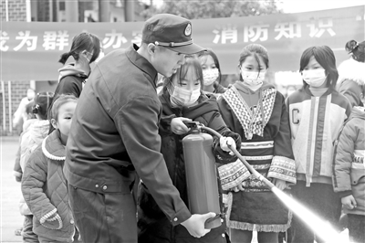 1月4日,在湖南省資興市唐洞街道茶坪瑤族村,小朋友在消防救援隊員的指導下學習滅火技能。當日,湖南省資興市消防救援大隊消防救援隊員來到唐洞街道茶坪瑤族村開展“萌娃學消防 平安度寒假”主題宣傳活動,小朋友們通過體驗消防器材裝備、學習滅火技能和消防安全知識等方式,提升假期消防安全意識和安全自救能力。李科 攝