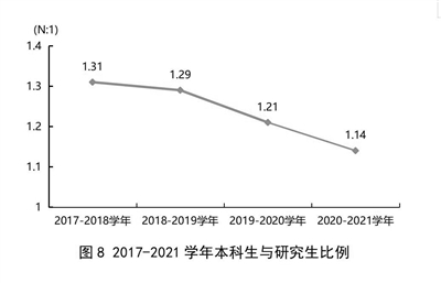 從招生結構上來看,數據顯示,從2017—2018學年至今,一流大學建設高校校均本科生與研究生比例持續下降,2020—2021學年,校均本科生與研究生比例已經接近1:1。