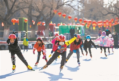 1月5日,孩子們在內蒙古自治區呼和浩特市青城公園公益冰雪場滑冰健身。寒假期間,呼和浩特市的許多中小學生到戶外參加冰雪運動,在愉悅的環境中鍛煉身體、增長知識,盡享冰雪樂趣。