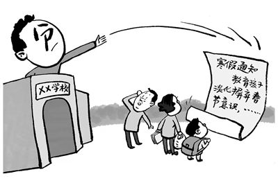 有評論指出,這所中學的寒假通知,是在消解傳統節日的意義,與教育部門的要求相悖,實在不是“用詞不當”,而是“觀念不當”。春節是傳統文化教育、親情教育、時事教育最好的時機,淡化甚至摒棄春節意識,無疑是揮之不去的唯分數論觀念在作祟。強調讓假期變“學期”,有可能破壞教學生態、教育節奏,讓孩子們對學習產生厭倦和逆反心理。