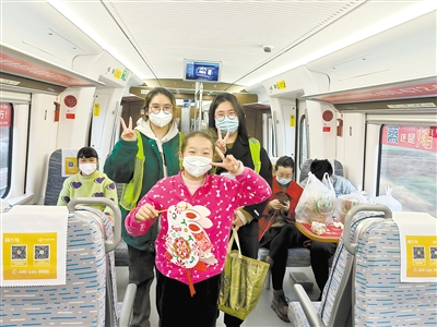 在此次活動中,“小青橙”志愿服務隊還專門策劃開展了黨的二十大精神微宣講活動,通過一個個知識問答,增加了與乘客們的互動,拉近了彼此的距離。此外,志愿服務隊還發揮專業優勢為乘客們提供肩頸按摩、測量血壓等健康服務,并為乘客送上喜慶的兔燈、福字、兔年口罩等小禮品,送上新年祝福,車廂內一派其樂融融的景象。