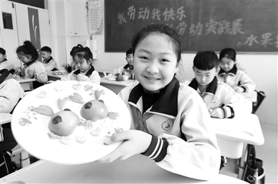近日,河北省多地中小學和幼兒園開學,學生們在豐富多彩的活動中開啟新學期。圖為2月7日,在河北石家莊新樂市民生街小學三年級(1)班,學生在勞動課上展示自己制作的水果拼盤。賈敏杰 攝