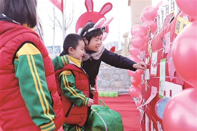 ③天津市薊州區第一幼兒園小朋友和園長媽媽一起貼心愿卡。薊宣 攝