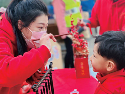 伴隨著春天的腳步,上海市寶山區淞南鎮星星幼兒園迎來了新學期。該園教師設計了豐富多彩的活動,營造輕松愉快的開學氛圍。圖為教師為幼兒“點朱砂”,祝福他們聰慧睿智、健康成長。季素琴 攝