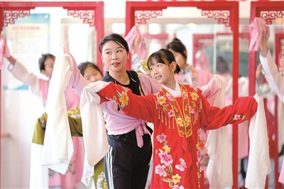 3月15日,在浙江省湖州市德清縣洛舍鎮中心學校,戲曲特色班的學生在教師的指導下學習戲曲基礎知識和戲曲表演技巧。