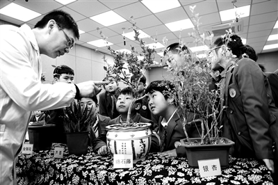 3月16日,第七批全國老中醫藥專家學術經驗傳承人沈志強帶領學生認識中草藥。當日,安徽省合肥市蚌埠路第二小學開展“感受中醫魅力弘揚中醫文化”活動,迎接3月17日“中國國醫節”,邀請沈志強為學生講解金銀花、石斛、絡石藤等常見中醫藥材的功用和療效,帶領學生認識穴位,感受中醫藥傳統文化的悠久歷史和博大精深。