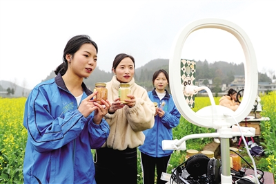 3月18日,貴州省黔東南苗族侗族自治州岑鞏縣中等職業技術學校電子商務專業的學生在油菜花地里學習直播銷售蜂蜜。近年來,該校將實操課程搬進田間地頭等生產一線,培養“訂單式”職業人才,拓寬畢業生就業渠道。新華社發