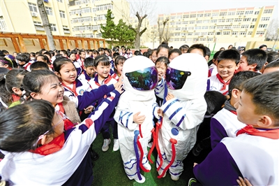 3月23日,在山東青島開平路小學舉辦的第二屆“校園科技節”主題活動上,扮成宇航員的學生吸引了眾多學生的目光。當天,該校學生通過體驗宇航服、無人機、機甲大師機器人等十余個科普項目,感受科技魅力。王海濱 攝