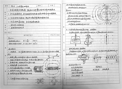 隨手翻開手寫教案上“電阻、電感、電容對交流電的影響”這一章節,知識點分類有序、簡潔明了,配有詳細圖示和心得體會。記者特意找到往年同題教案,仔細觀察發現,兩本教案上的內容并不一樣。