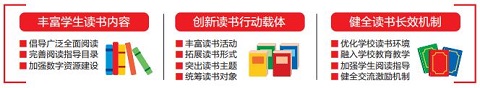 《實施方案》要求,豐富學生讀書內容,根據青少年學生認知規律和身心發展特點,引導青少年學生珍惜大好年華,倡導廣泛全面閱讀;結合中小學課程標準要求,做好內容審核把關,確保青少年學生讀物質量,完善閱讀指導目錄;充分發揮數字化支撐作用,開設國家智慧教育讀書平臺,有效利用“學習強國”、中國語言文字數字博物館及各地各校數字平臺,加強數字資源建設。在創新讀書行動載體方面,要豐富讀書活動,各地各校要因地因校制宜,著力打造富有吸引力、影響力的青少年學生讀書品牌項目,學校要組建學生讀書社團或興趣小組;拓展讀書形式,實施師生共讀行動,名家領讀行動、家庭親子閱讀行動;突出讀書主題,實施“學習新思想 做好接班人”主題讀書行動、“學科學 愛科學”主題讀書行動、“典耀中華”主題讀書行動;統籌讀書對象,面向職業院校學生實施“未來工匠”讀書行動,面向普通高校學生實施“書香激揚青春”讀書行動,面向農村中小學生實施“我的書屋·我的夢”讀書行動。