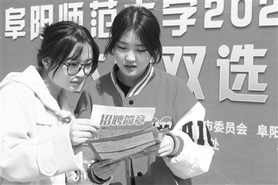 近日,求職大學生在雙選招聘會現場了解招聘信息。日前,安徽省阜陽市“暖民心·促就業”招才引智校園行暨阜陽師范大學2023屆畢業生大型雙選會在阜陽師范大學體育中心南廣場舉辦。王彪 攝