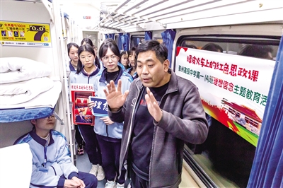 近日,浙江省寧波市鄞州高級中學教師與學生們在火車車廂內互動。一輛綠皮火車載著千名學生,從寧波駛向南京,一堂思政課也在學生們的好奇中拉開了序幕。錢彬 攝