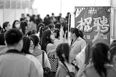 4月21日,求職者在招聘會(huì)現(xiàn)場(chǎng)查看崗位信息。