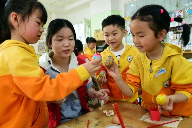 5月4日,在江蘇省鎮江市金山水城幼兒園,江蘇科技大學志愿者指導小朋友玩斗蛋游戲。當天,江蘇科技大學志愿者來到鎮江市金山水城幼兒園,開展“畫蛋斗蛋 喜迎立夏”活動,帶著小朋友一起描畫彩蛋、玩斗蛋游戲,感受立夏傳統民俗,迎接立夏節氣的到來。石玉成 攝