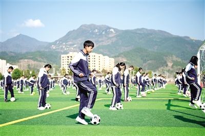 近日,四川省廣元市朝天區羊木中學學生在大課間練習“足球操”,沐浴春光,強健身體。王浚錄 攝