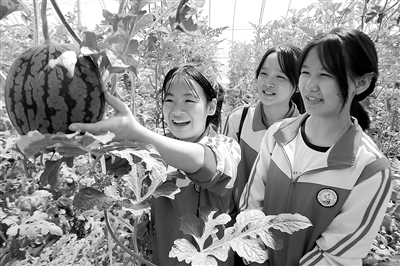 近日,在山東省高密市柴溝鎮五龍河現代農業智慧園大棚內,柴溝中學學生觀察“空中西瓜”的長勢。該校組織學生開展農業科普課外實踐研學活動,實地了解“空中西瓜”、藍莓、櫻桃等特色農作物的種植技術,讓學生感受現代農業科技的魅力。李海濤 攝