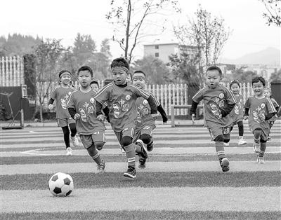5月24日,貴州省銅仁市玉屏侗族自治縣皂角坪中心幼兒園的孩子們在踢足球。近年來,玉屏侗族自治縣幼教集團在全縣幼兒園廣泛開展足球運動教育,配備專業教練員,教授幼兒足球知識和技藝,讓孩子們享受足球運動帶來的快樂。