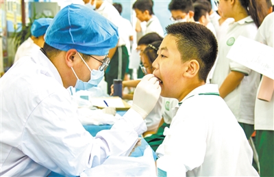 近日,醫生在為學生做牙齒檢查。北京市通州區南關小學組織全體學生進行每年一次的例行身體檢查,包括眼科、內科等9大項25小項常規檢查,及時了解學生身體生長情況,科學管理學校衛生保健工作。宋利成 攝