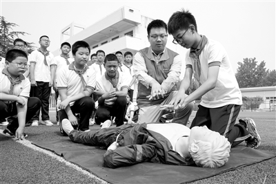 6月16日,小學生們在青年志愿者的指導下學習觸電急救技能。