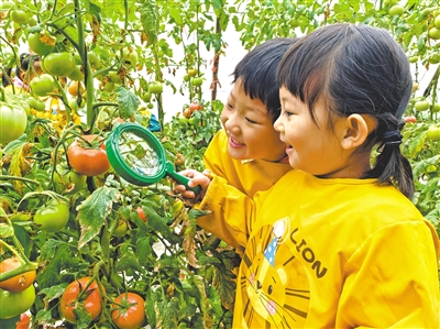 為了讓勞動教育常態化、長效化,讓幼兒在尊重勞動、熱愛勞動的氛圍中健康成長,甘肅省張掖市高臺縣第六幼兒園充分挖掘縣域周邊教育資源,拓展校外課堂,開展了以“融勞蘊美樂成長”為主題的勞動實踐體驗活動。圖為幼兒在溫室大棚里觀察西紅柿生長狀態。本報記者 鄭芃生 通訊員 楊麗麗 攝