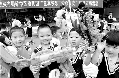 近日,江西省德興市銅礦中區幼兒園的孩子們在參加跳蚤市場義賣活動。該園舉辦“”幼兒園內跳蚤市場義賣活動,上百名大班的小朋友在教師的指導下,義賣分享閑置玩具、舊書籍、手工制作、小飾品等。活動后,幼兒園將義賣所得的1300元捐給該市20多年領養80多名殘疾棄嬰的“愛心媽媽”饒梅香。卓忠偉 徐穎 攝