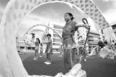 6月25日,在福建省福州市倉山區教師進修學校附屬第一小學,學生們正在進行新型彩帶龍展示。近年來,該校積極創新陽光體育大課間活動內容,將傳統體育項目列為校本課程,聘請了非遺傳承人組建舞龍、舞獅社團,進行基礎專業技藝訓練,讓學生在豐富多彩的文體活動中鍛煉身體、共享陽光、快樂成長。謝貴明 攝