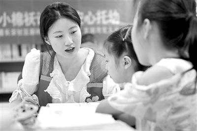 7月6日,家住安徽省六安市金安區(qū)東市街道長(zhǎng)安社區(qū)、就讀于安徽宿州學(xué)院英語(yǔ)專業(yè)的大學(xué)生胡靜在輔導(dǎo)小朋友做暑假作業(yè)。
