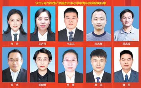 本報北京7月13日訊(記者 楊亞輝)今天,2022年“寶武杯”全國杰出中小學中青年教師表彰會在京舉行。湖北省武漢市旅游學校馬丹、吉林省長春市特殊教育學校王丹丹、福建省福州市閩清縣杉村學校毛文丑、江西省萍鄉(xiāng)武功山風景名勝區(qū)麻田中心學校朱志輝、陜西省商洛市丹鳳縣蔡川九年制學校孫志成、山西省呂梁市臨縣臨泉鎮(zhèn)柏樹溝九年制學校張杰、上海市華東師范大學第一附屬中學陳明青、遼寧省朝陽市第一高級中學房麗、貴州省六盤水市鐘山區(qū)大灣鎮(zhèn)海嘎小學顧亞、北京市第四中學魏華共10位教師獲得金獎,江蘇省南菁高級中學馬維林等21位教師獲得銀獎。教育部黨組成員、副部長翁鐵慧出席表彰會,向獲獎教師們表示熱烈祝賀并頒獎。