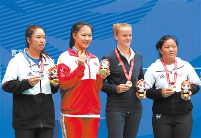 8月6日,在成都舉行的第31屆世界大學生夏季運動會網球女子單打決賽中,中國選手郭涵煜(左二)以2比1戰勝中國臺北選手楊亞依,奪得冠軍。