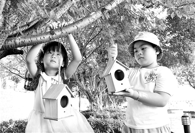 8月15日,湖南省永州市江永縣瀟浦鎮(zhèn)德智幼兒園暑托班的小朋友在懸掛鳥巢。當(dāng)天是首個全國生態(tài)日,該幼兒園舉行“掛巢引鳥”活動,以實際行動愛鳥護鳥,保護生態(tài)家園。