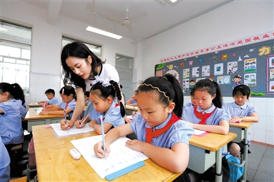 9月11日,江蘇省無錫市揚名中心小學教師指導學生寫漢字。當日,該校開展推普周主題宣傳活動,以營造“講好普通話 寫好規范字”的良好氛圍,增強師生的語言文字規范意識和推廣普通話的參與意識。