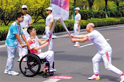 9月12日,杭州第19屆亞運會火炬在寧波傳遞,寧波職院341名志愿者為亞運“薪火”相傳保駕護航。圖為志愿者為火炬?zhèn)鬟f提供志愿服務。學校供圖