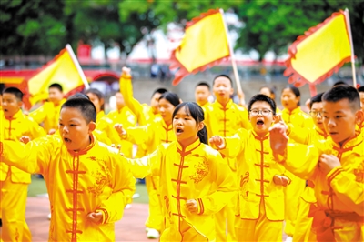 10月10日,在福建師范大學附屬中學初中部的田徑運動會上,孩子們正在進行五祖拳非遺體育項目展示。當日,在該校初中部田徑運動會上,孩子們以舞龍、五祖拳、彩帶龍等非遺體育運動項目為主題進行運動成果展示,進一步傳承和弘揚中華體育精神。謝貴明 攝