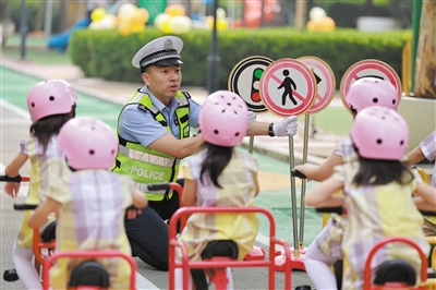 日前,河北省邢臺市內丘縣交警、消防等部門走進內丘縣第三幼兒園,引導孩子們辨識交通安全標志、認識消防器材、學唱交通安全歌,為孩子們送去“安全大禮包”。圖為交警引導孩子們學習交通安全知識。通訊員 劉繼東 攝
