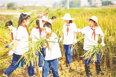 10月15日,安徽省蕪湖市繁昌區(qū)繁陽(yáng)鎮(zhèn)城關(guān)一小,教師組織學(xué)生去校外勞動(dòng)基地開(kāi)展水稻收割勞動(dòng)實(shí)踐活動(dòng)。活動(dòng)的開(kāi)展讓同學(xué)們感受到豐收的喜悅,同時(shí)也體會(huì)到糧食的來(lái)之不易。田園園 攝