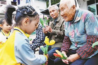 近日,江西省德興市銅礦幼兒園大班的孩子在教師的陪同下,來到該市泗洲鎮(zhèn)敬老院,為這里的爺爺奶奶送去慰問蛋糕、牛奶和節(jié)日的問候。在重陽節(jié)到來之際,該園開展“九九重陽節(jié) 濃濃敬老情”走進(jìn)敬老院社會實踐活動,孩子們?yōu)榫蠢显豪锏臓敔斈棠瘫硌萘烁栉琛⒒优那颉⑻K等節(jié)目,將滿滿的愛意送到爺爺奶奶的手中。