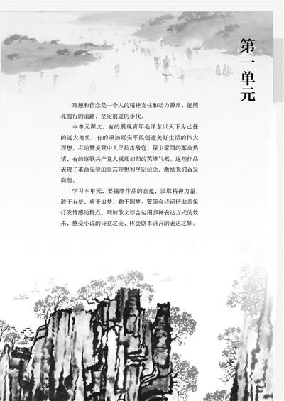 中職語文統編教材針對文本單元,根據培養學生的“理想信念”“文化自信”“責任擔當”的核心目標,凝練出來的17個單元立意,系統體現了重大主題教育的相關內容。單元立意是組織單元和選擇課文的重要線索之一。每個單元的單元導語,都會在第一自然段對本單元的立意進行解析,并在其他自然段的特定位置對本單元的人文目標作出明確表述,從而讓教師和學生能夠有意識地用這條線將單元中的各個板塊貫通起來,形成育人合力。