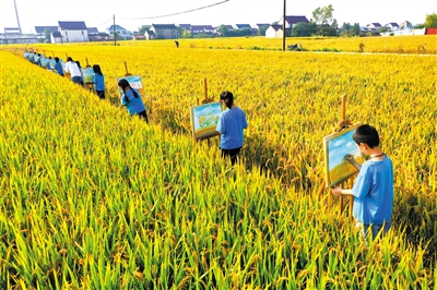 近日,江蘇省如皋市丁堰鎮劉海小學的學生們在金色的稻田里用畫筆描繪家鄉豐收美景。該校教師帶著繪畫社團的學生們來到稻田里“畫豐收”,感受秋天的氣息。徐慧 攝