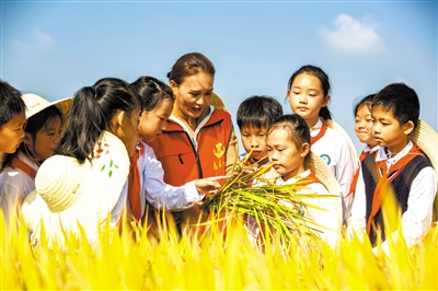 近日,江蘇省海安市大公鎮中心小學學生在田間聽教師講解水稻種植知識。豐收時節,學生們在教師的帶領下到田間學農識、習農耕、做農事,感受勞動樂趣,知曉每一粒糧食的來之不易。翟慧勇 攝