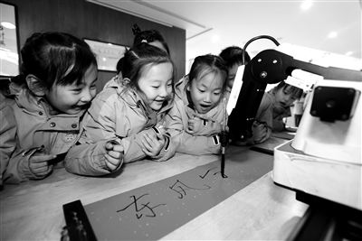 近日,青島通濟實驗學校學生觀看機器人寫書法。該校舉辦以“走近科學,擁抱未來”為主題的“校園科技節”活動,學生們在教師指導下切身體驗并學習“機器狗”、3D打印等30余個項目。
