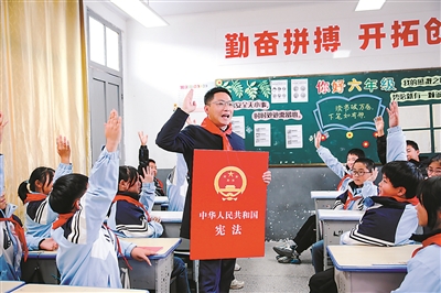 12月4日,在江蘇省如皋市下原鎮(zhèn)山珀小學(xué),學(xué)生參與憲法知識競答。在第十個國家憲法日,如皋市教育局通過開展豐富多彩的憲法主題教育宣傳進(jìn)校園活動,為學(xué)生普及憲法知識,增強法治觀念,弘揚憲法精神。
