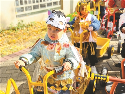 陳鶴琴先生說,大自然、大社會都是活教材。日前,浙江省杭州市蕭山區開悅幼兒園的孩子們將童話劇場搬進大自然,或唱、或跳、或演,用陽光、大樹、葉子編織一個個童話夢。圖為孩子們化身童話劇《鴨子騎行記》中快樂騎行的鴨子,并用落葉裝扮自己。傅凱懿 圖 吳潤之 文