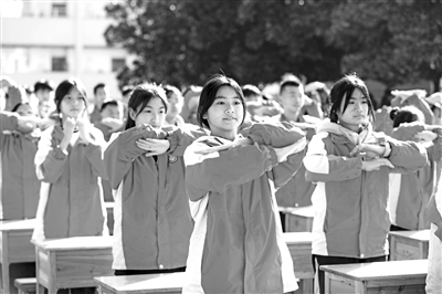 日前,貴州省黔西市鐘山鎮鐘山中學學生在課間表演課桌操。今年以來,鐘山中學結合校園實際,組織編排形式多樣、風格獨特的課桌操,幫學生提高身體素質,緩解學習壓力。 周訓超 攝