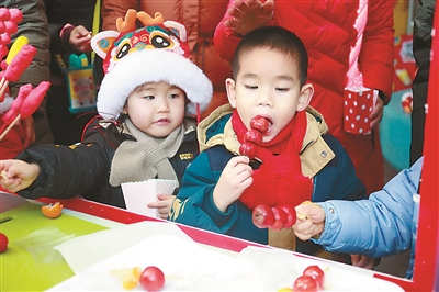 近日,中國兒童中心實驗幼兒園舉辦了第四屆“冬之語”活動,老師們把廟會“搬進”了幼兒園。教學樓大廳、藝術宮一層走廊里,熙熙攘攘,熱鬧非凡;美食一條街上,糖葫蘆、棉花糖、爆米花飄出陣陣香氣;孩子們創作的年畫充滿童趣;愛心義賣場人頭攢動……在真實體驗中,孩子們感受年俗、共享年趣。圖為孩子們品嘗手工制作的糖葫蘆。楊麗莎 攝