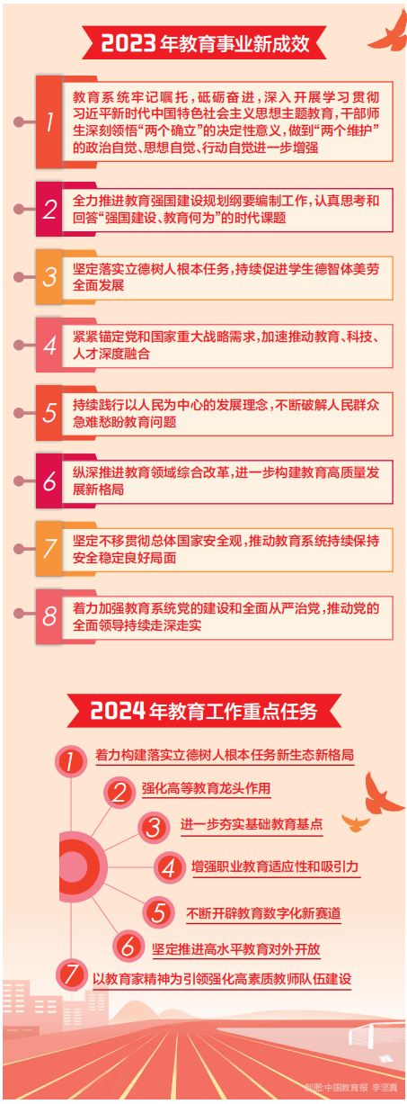 會議指出,剛剛過去的2023年,是全面貫徹黨的二十大精神的開局之年,是實施“十四五”規(guī)劃承上啟下的關(guān)鍵一年,也是三年新冠疫情防控轉(zhuǎn)段后經(jīng)濟恢復發(fā)展的一年。一年來,在習近平總書記親自關(guān)心、親自部署、親自推動下,教育系統(tǒng)牢記囑托,砥礪奮進,深入開展學習貫徹習近平新時代中國特色社會主義思想主題教育,干部師生深刻領(lǐng)悟“兩個確立”的決定性意義,做到“兩個維護”的政治自覺、思想自覺、行動自覺進一步增強;全力推進教育強國建設(shè)規(guī)劃綱要編制工作,認真思考和回答“強國建設(shè)、教育何為”的時代課題;堅定落實立德樹人根本任務,持續(xù)促進學生德智體美勞全面發(fā)展;緊緊錨定黨和國家重大戰(zhàn)略需求,加速推動教育、科技、人才深度融合;持續(xù)踐行以人民為中心的發(fā)展理念,不斷破解人民群眾急難愁盼教育問題;縱深推進教育領(lǐng)域綜合改革,進一步構(gòu)建教育高質(zhì)量發(fā)展新格局;堅定不移貫徹總體國家安全觀,推動教育系統(tǒng)持續(xù)保持安全穩(wěn)定良好局面;著力加強教育系統(tǒng)黨的建設(shè)和全面從嚴治黨,推動黨的全面領(lǐng)導持續(xù)走深走實。一年來,教育系統(tǒng)始終堅持從政治上看教育、從民生上抓教育、從規(guī)律上辦教育,推動教育事業(yè)取得新突破,教育高質(zhì)量發(fā)展打開新局面,為黨和國家工作大局作出了新的貢獻。