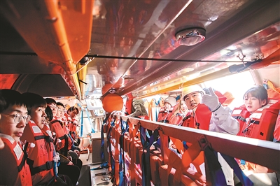 逃生技能學習是另一節充滿體驗感的課程,師生們穿上救生衣、帶著防寒服,在海風凜冽的甲板上集合,有序進入逃生艇。“東3”船的大副一邊維持秩序,一邊為大家介紹逃生艇內的設施和應急物品。狹小逼仄的艇內空間,給逃生演習增添了一分緊張感,也讓師生們對海洋科考工作的風險有了真切的體驗。