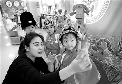 近日,河北省淶水縣第二幼兒園教師輔導(dǎo)小朋友學(xué)習(xí)戲曲表演。該園充分挖掘地域文化資源,以大班為起點(diǎn)、以樓道為場所,深入探索開展“尋脈中華傳統(tǒng)”項(xiàng)目課程,讓每個孩子觸摸歷史,感知中華優(yōu)秀傳統(tǒng)文化的深厚韻味。