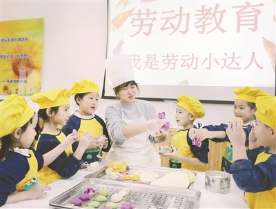 日前,一場熱鬧的“我是勞動小達人”活動在山東省青島市市北區樺川路幼兒園舉行。該園依托“十四五”規劃課題,通過一日生活中的勞動教育,培養幼兒獨立自主能力,讓幼兒學會自己穿衣、整理物品、擦桌子、照顧動植物等,爭做勞動小達人。圖為大班幼兒在教師指導下學做面食。本報記者 孫軍 攝