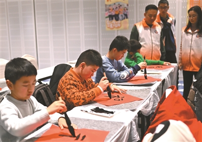 1月31日,寒托班的同學們在寫福字。近日,上海市首次開辦小學生愛心寒托班。春節(jié)前,記者走進位于上海市松江區(qū)中山街道中建·幸孚公寓的辦班點,這里開辦了全市首個“新時代城市建設者管理者子女愛心寒托班”。本次寒托班主要招收外賣騎手、快遞員、網約車司機等新就業(yè)青年群體的子女,且不限上海學籍,以緩解這些青年家庭的寒假“看護難”問題。新華社記者 劉穎 攝