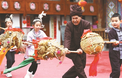 2月4日,廣西桂林市龍勝各族自治縣平等鎮(zhèn)廣南村,村里的老人帶孩子們一起舞草龍。立春當(dāng)日,廣南村的侗族老少身著盛裝,舉行鬧春牛、春牛巡游祈福、舞草龍、演唱琵琶歌等民俗活動(dòng),喜迎新春到來(lái)。粟勇主 攝